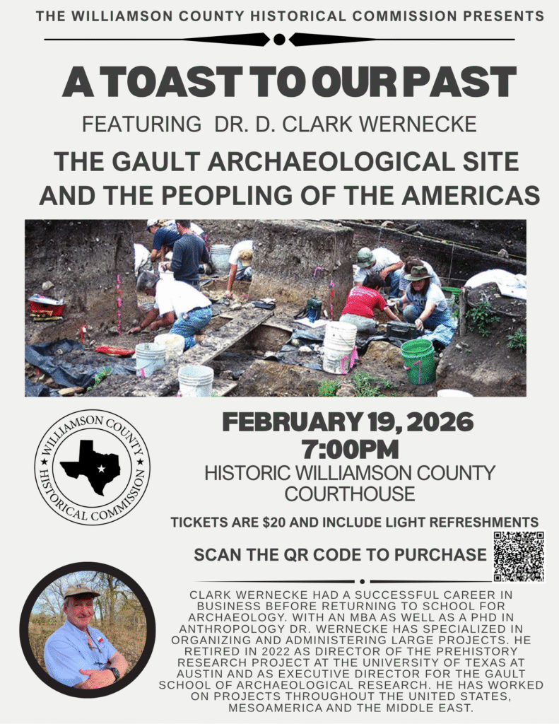 Join the Williamson County Historical Commission for a fascinating evening as we raise a glass to our shared history! This edition of A Toast to Our Past features Dr. Clark Wernecke, who will share groundbreaking insights into the Gault Archaeological Site—one of the most significant Paleoindian sites in North America. Dr. Wernecke weaves a delightful tale of human evolution sharing information gleaned from his three decades long career as a researcher, educator and archeologist. Discover how the findings from Central Texas are reshaping what we know about the earliest people to inhabit the Americas, and enjoy an evening of history, conversation, and community.